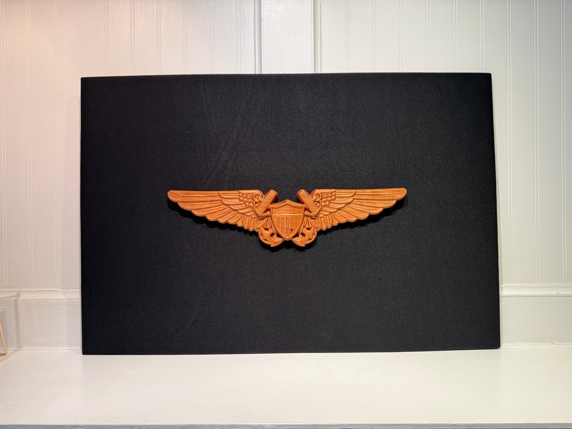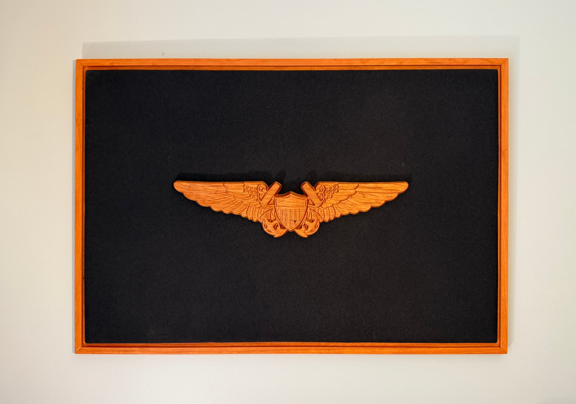 Display your proud achievements and memories with the Naval Flight Officer Patchboard! Organize and showcase your patches on this specially designed board that surrounds your wings carved in the center. Perfect gift to celebrate a winging, retirement, or simply a way to display your aviation heritage. Wings are made of American cherry wood with a natural stained finish to highlight the beauty of each piece of wood. Made to Order. Current production time: Framed: 1-2 weeks, Unframed: 5-7 days, Callsign/Name Plates ~1 day